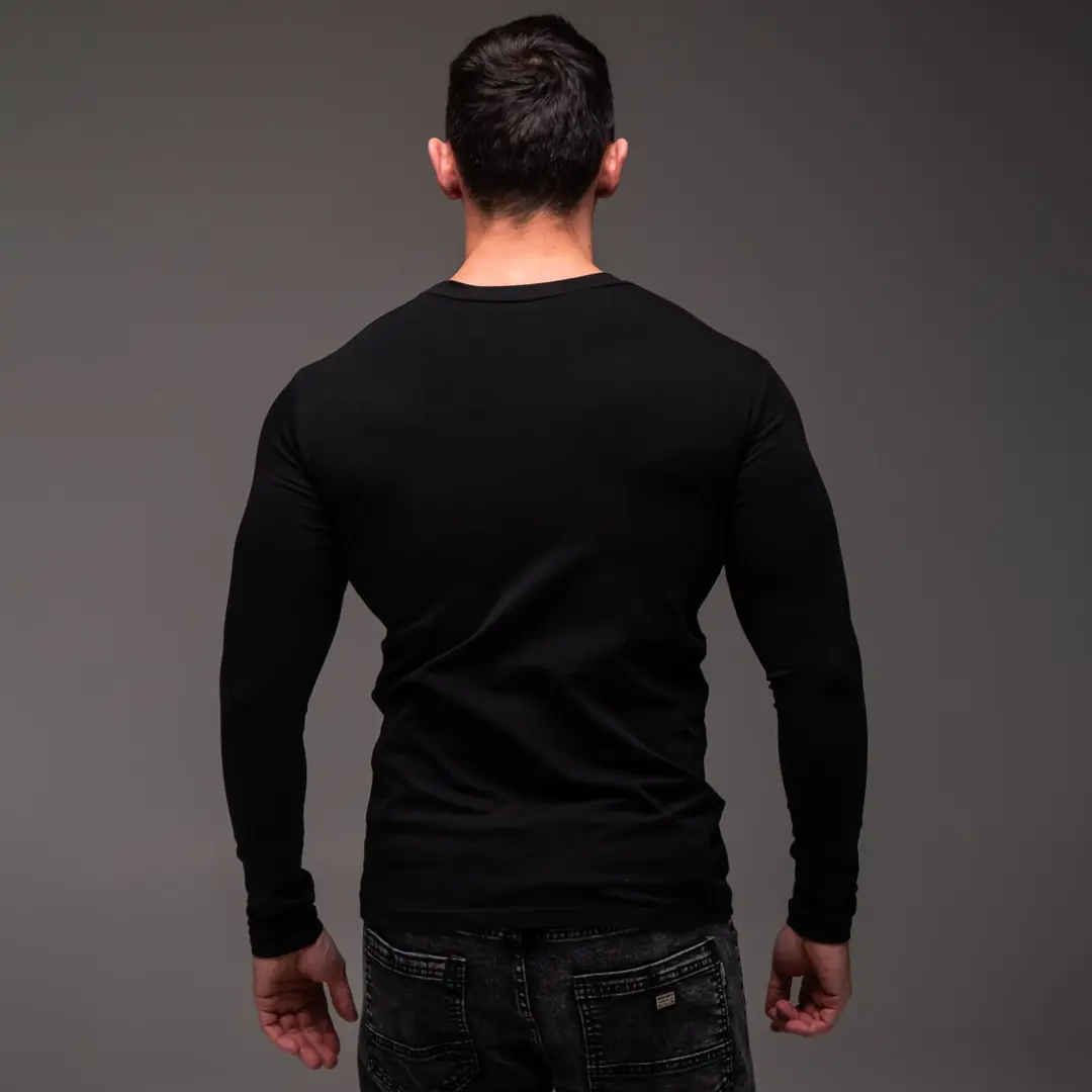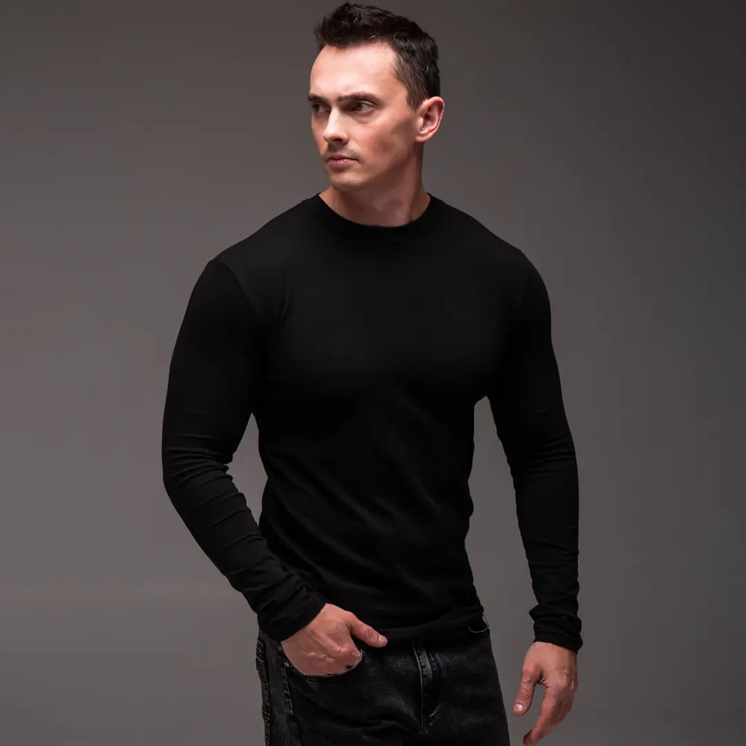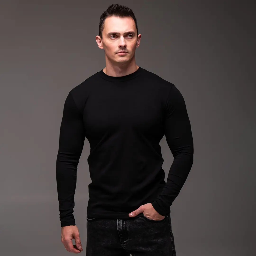 Базовий чоловічий лонгслів Long Black (чорний) прекрасно поєднується з джинсами, чиносами та спортивними штанами. Він стане відмінною базою під кардиган, бомбер або джинсову куртку. Для офісного стилю можна доповнити образ класичними брюками та піджаком. У спортивному луці лонгслів гармонійно виглядає з джоггерами та кросівками.