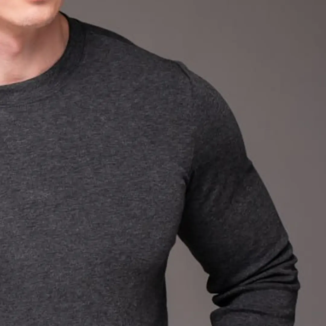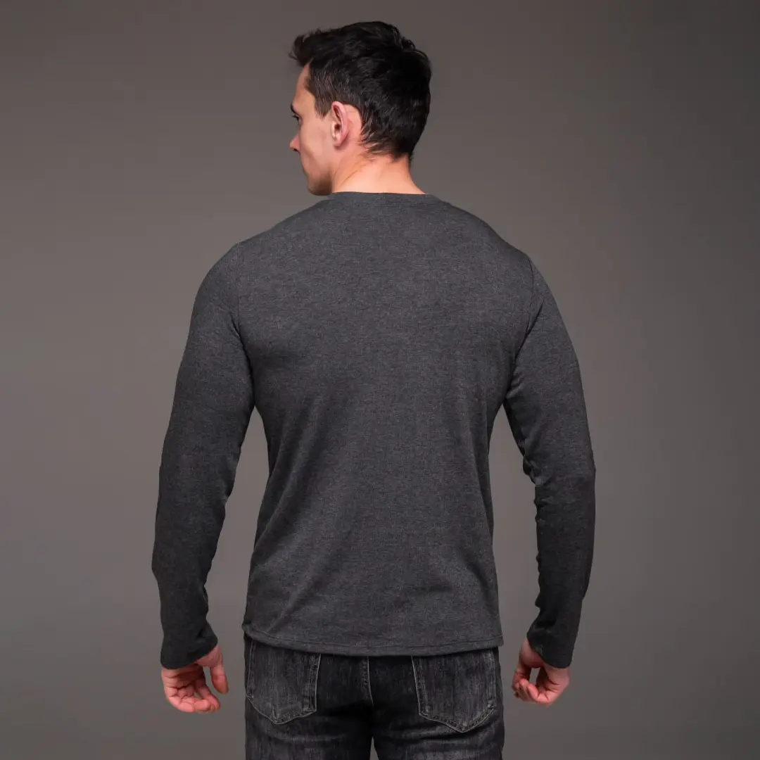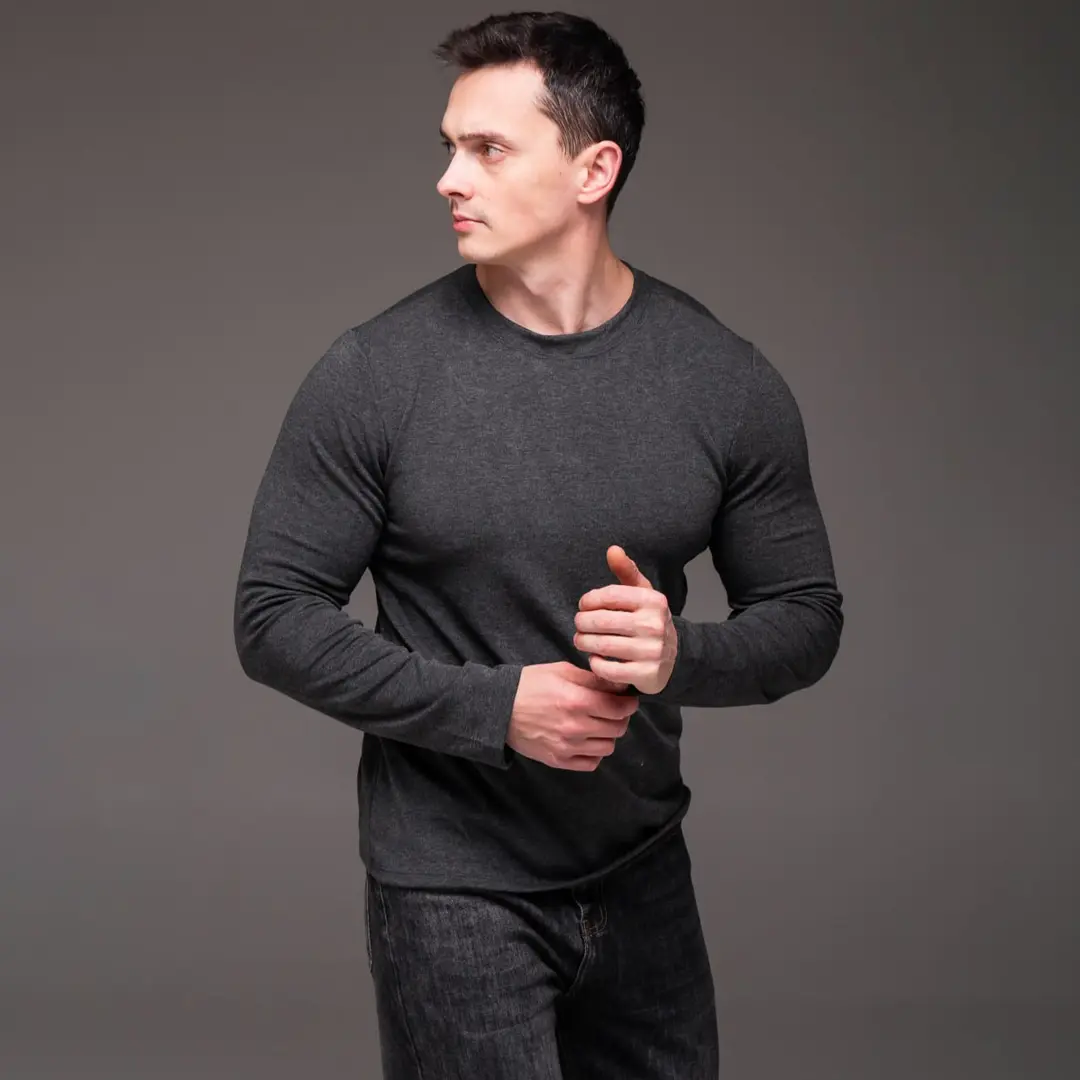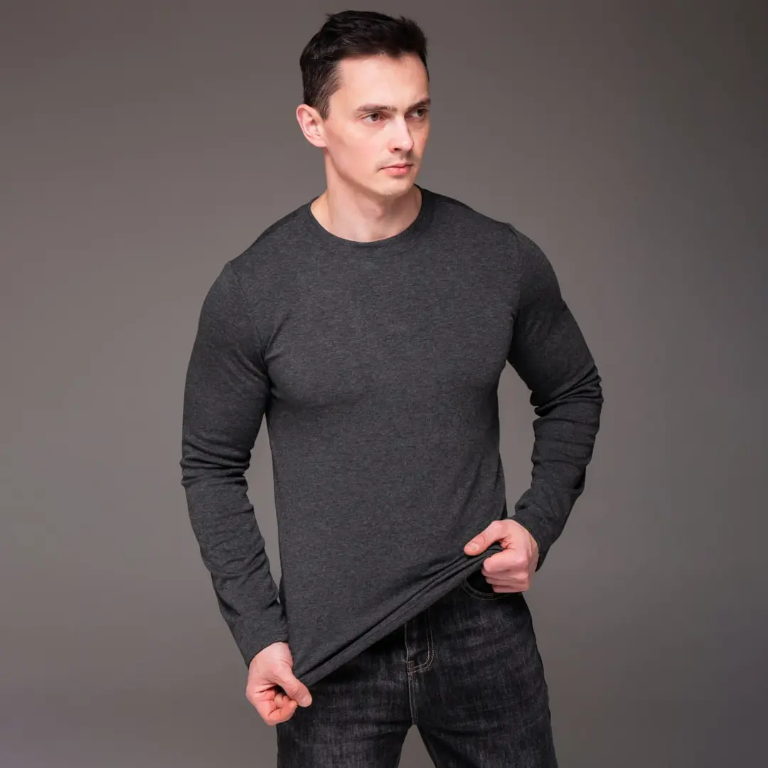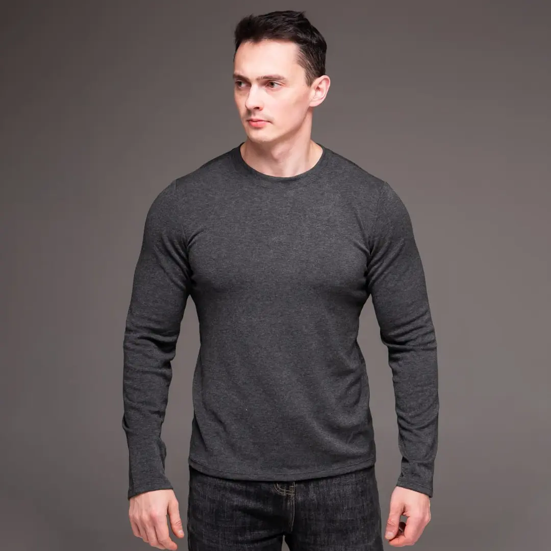 Темно-сірий відтінок – один із найуніверсальніших у чоловічому гардеробі. Він не маркий, не впадає у вічі, але завжди виглядає акуратно. Такий лонгслів однаково доречний вдома, на тренуванні чи під час прогулянки.