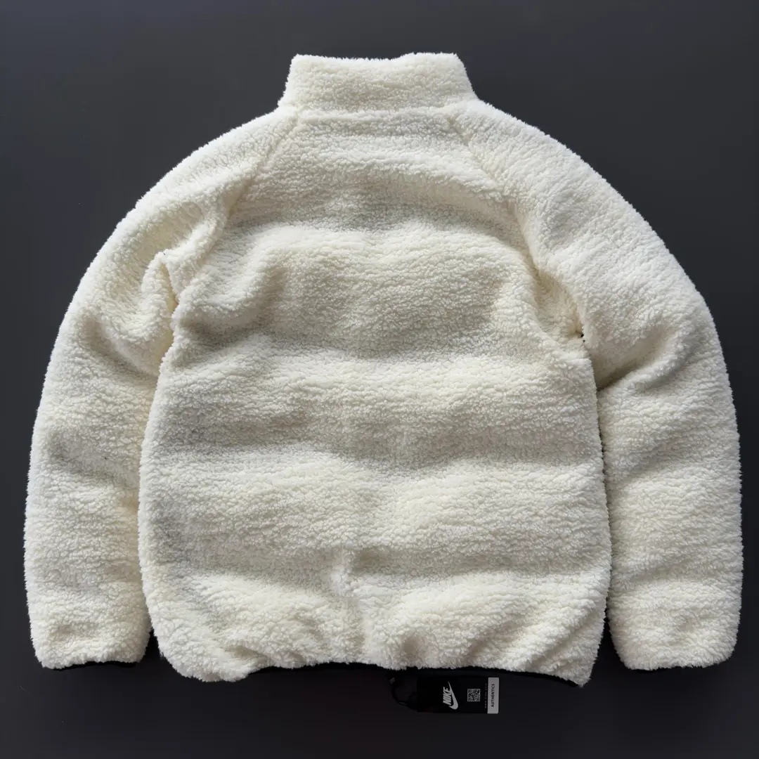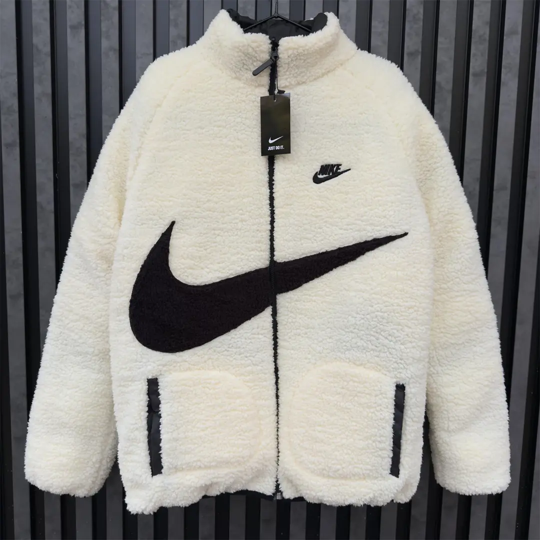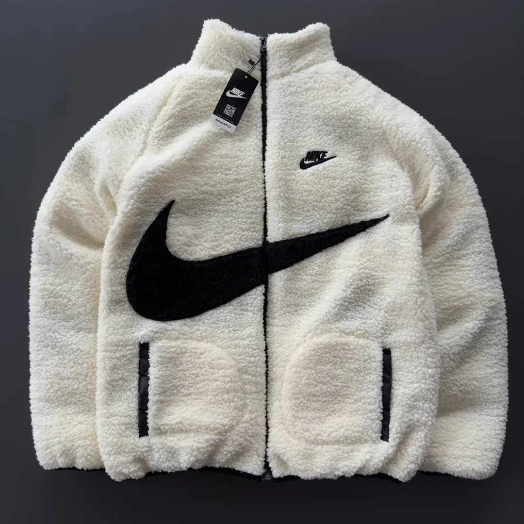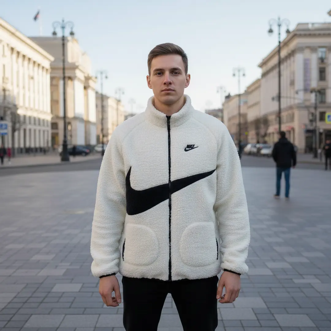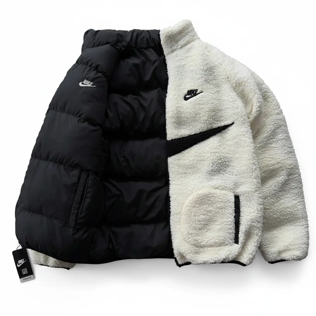 Ця чоловіча двостороння куртка Nike (чорно-біла) вироблена в Туреччині. Зовнішня тканина плащівка з водовідштовхувальними властивостями. Матеріал не пропускає вітер, допомагає залишатися в теплі під час морозу та вологого повітря. Усередині штучна овчина, що утримує тепло та створює комфортну посадку по тілу. Наповнювач холлофайбер добре зберігає форму та додає об’єму без зайвої ваги.