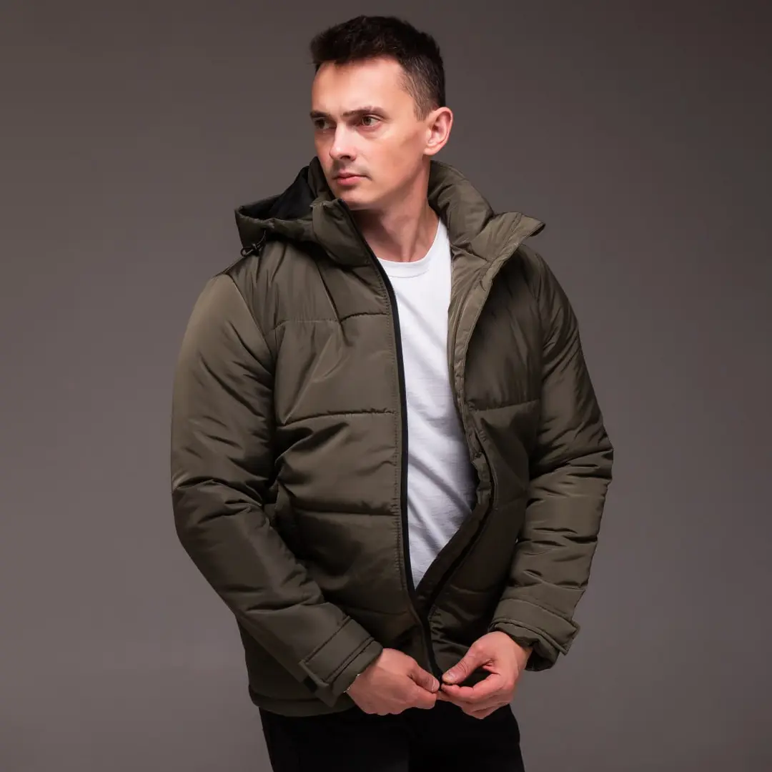 Зелений колір куртки легко вписується у чоловічий гардероб і не маркий у повсякденному використанні. Цей відтінок гармонійно поєднується з джинсами темних кольорів, чорними або сірими штанами. До такої куртки підійдуть класичні кросівки, черевики або зимові чоботи. Доповніть образ в’язаною шапкою та шарфом нейтральних відтінків – і ваш зимовий лук буде завершеним.