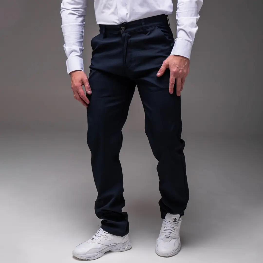 Темно-сині штани стануть базою для створення різноманітних образів. Вони чудово поєднуються з білими сорочками, поло, светрами та кардиганами. До них підійдуть як кросівки, так і класичні туфлі. Для завершення образу можна додати шкіряний ремінь та годинник.