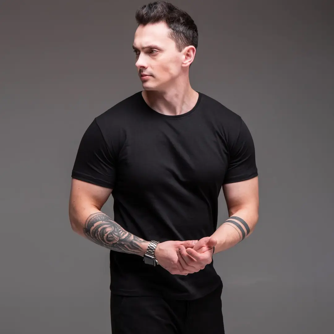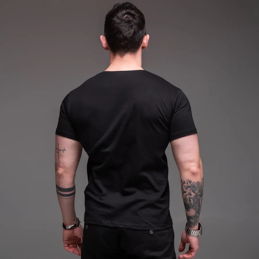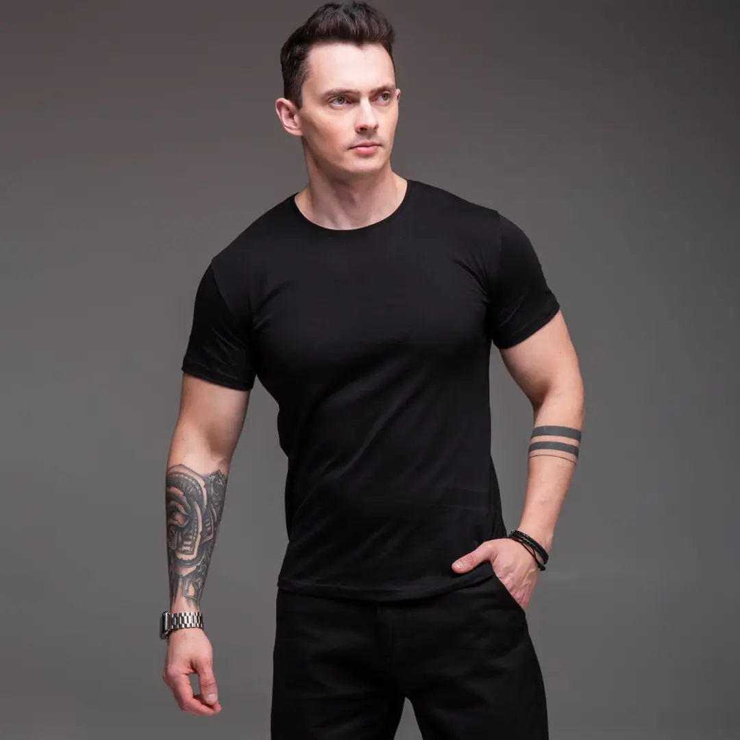 Футболка чудово поєднується з джинсами, чиносами або спортивними штанами. Для офісного стилю доповніть образ класичними брюками та піджаком. Casual look створіть за допомогою шортів та кросівок. Чорна чоловіча футболка базова, бавовна стане відмінною базою під шкіряну куртку або бомбер у прохолодну погоду.