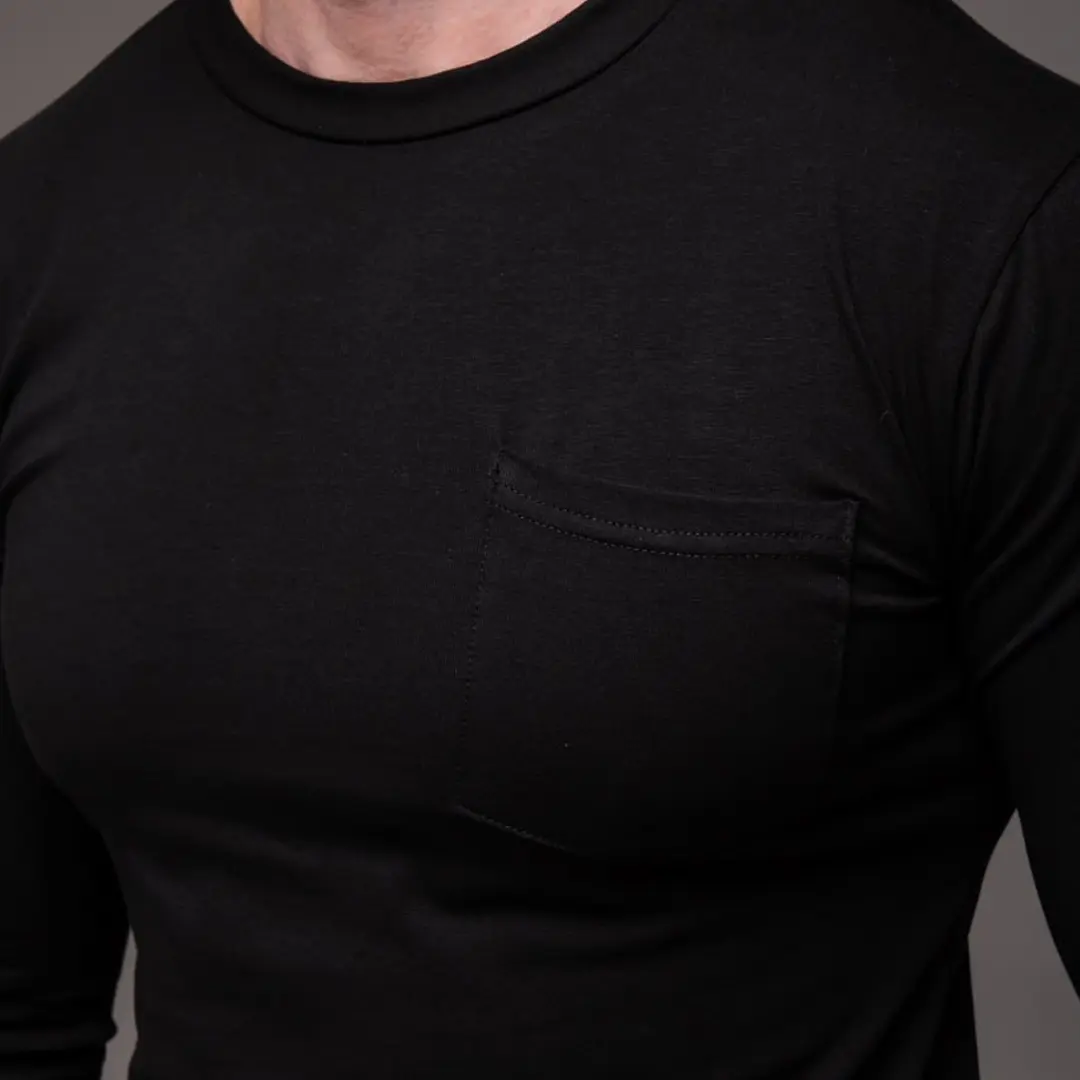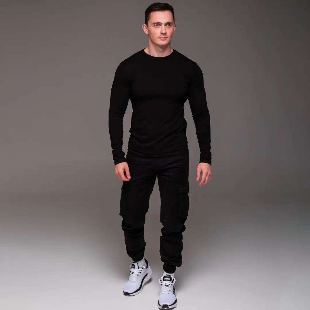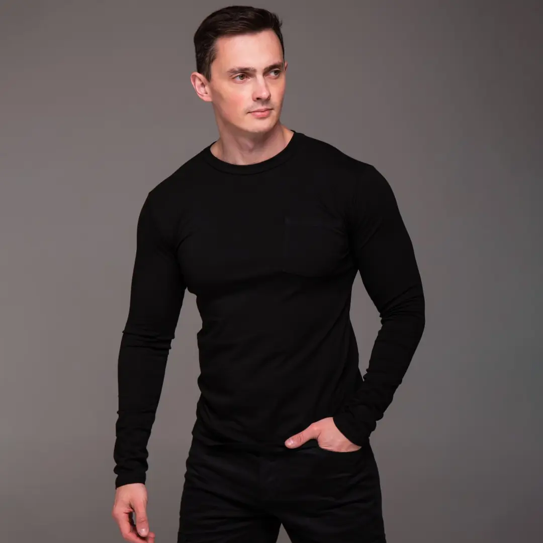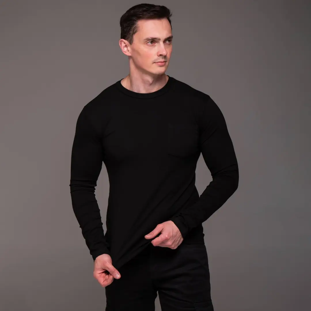 Футболка з довгими рукавами лонгслів з кишенею (чорна) підійде тим, хто цінує комфорт, простоту та практичність. Модель актуальна для міських прогулянок, тренувань у залі, роботи або відпочинку вдома.