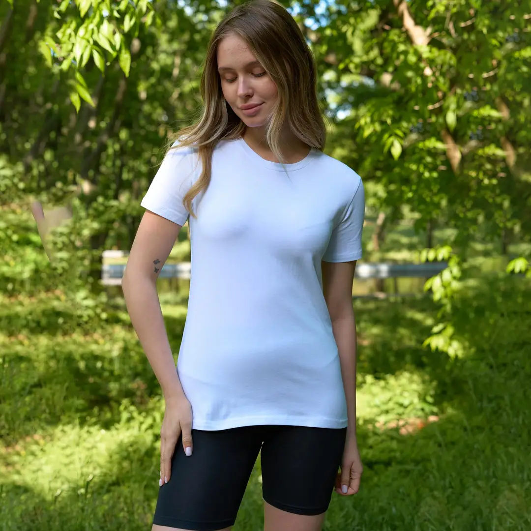 Футболка виконана у класичному стилі — зручна та універсальна. Вона пасує як до кросівок, так і до босоніжок, а мінімалістичний дизайн дозволяє поєднувати її з будь-яким верхнім одягом або аксесуарами. Велосипедки доповнюють образ, створюючи стриманий і водночас стильний лук, який підкреслює жіночність та легкість.