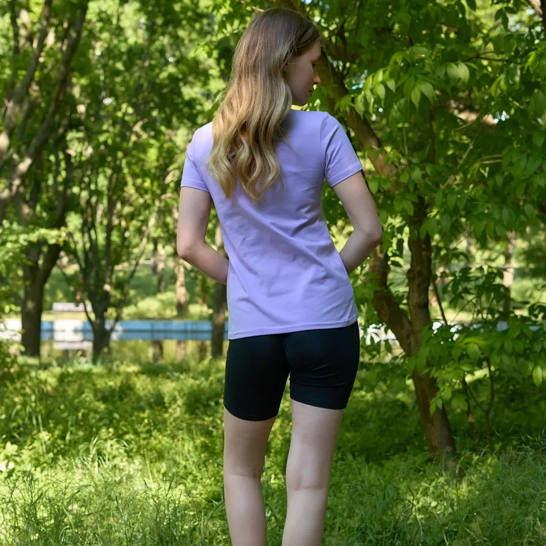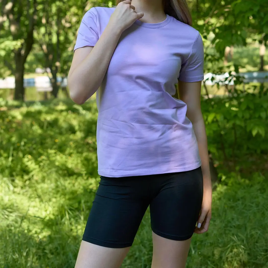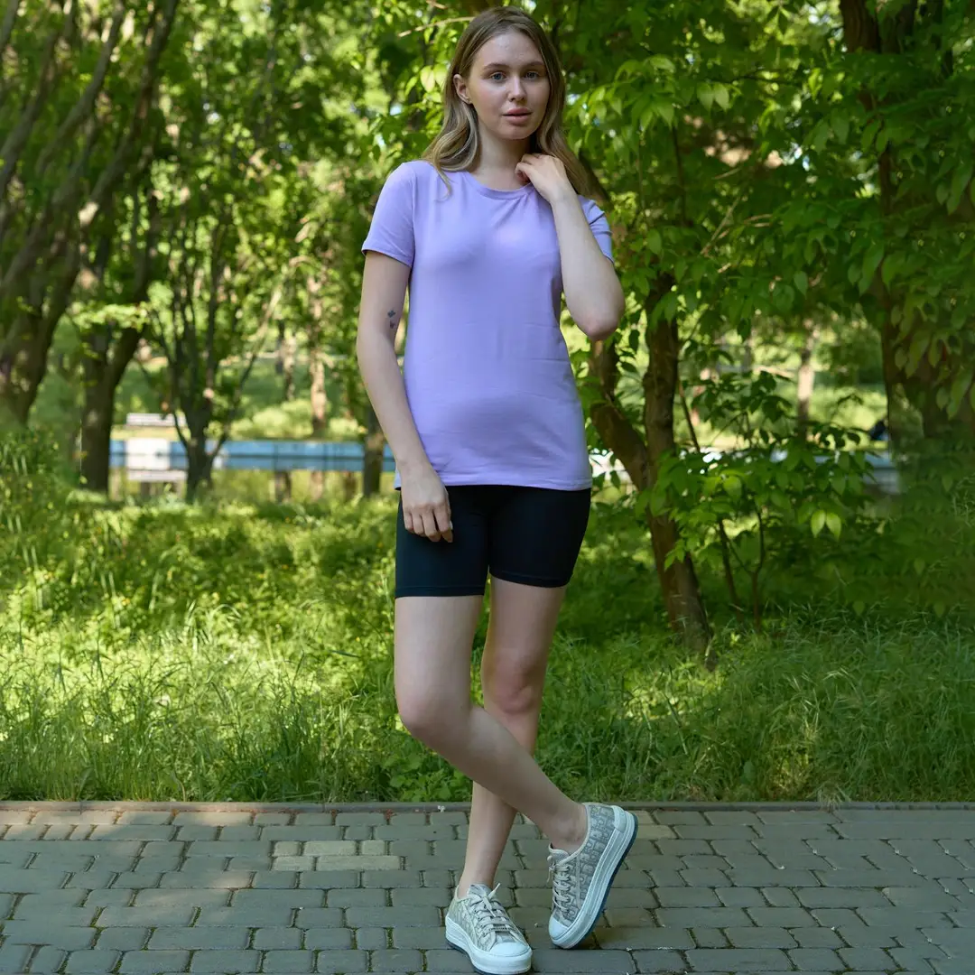 Футболка виконана у класичному стилі — зручна та універсальна. Вона пасує як до кросівок, так і до босоніжок, а мінімалістичний дизайн дозволяє поєднувати її з будь-яким верхнім одягом або аксесуарами. Велосипедки доповнюють образ, створюючи стриманий і водночас стильний лук, який підкреслює жіночність та легкість.