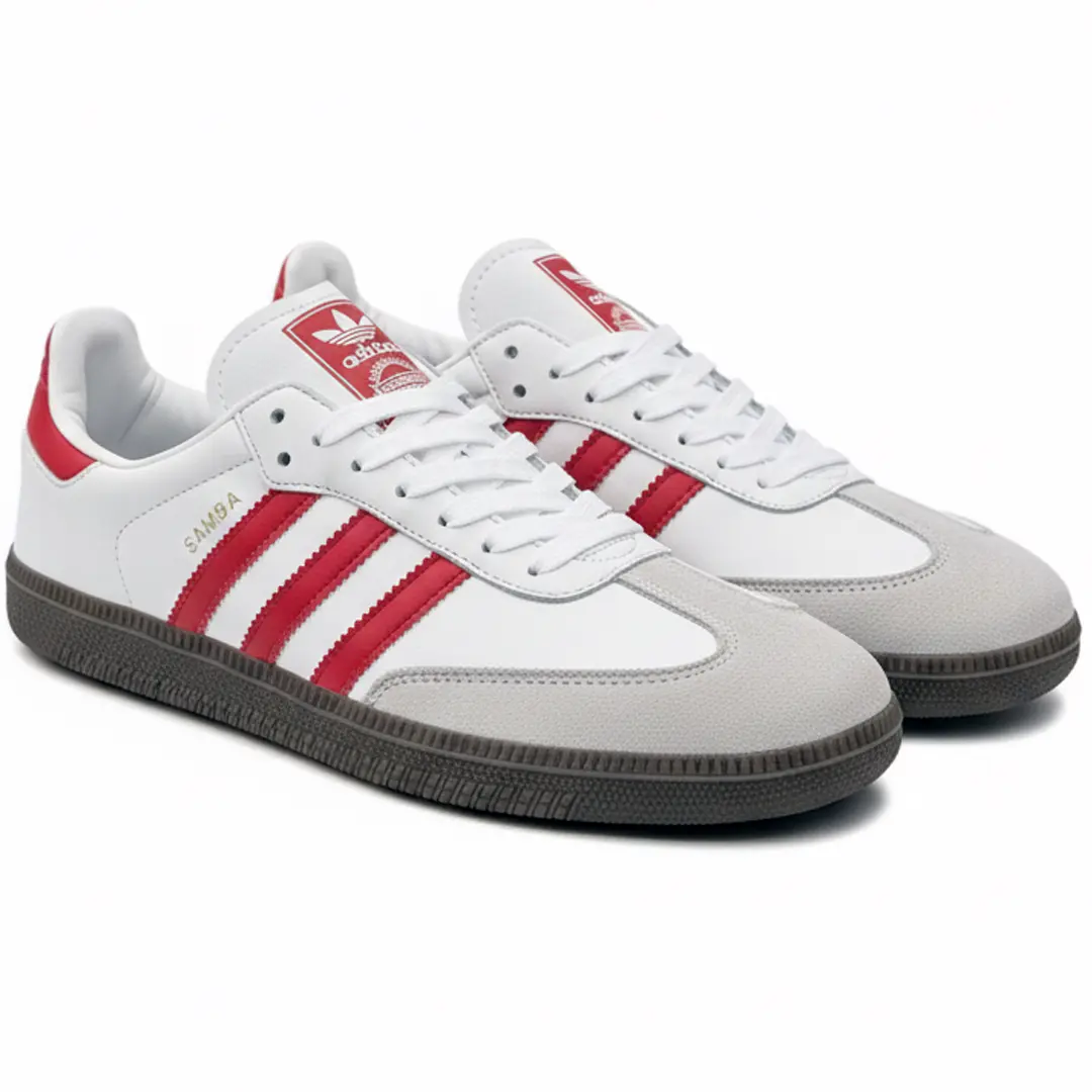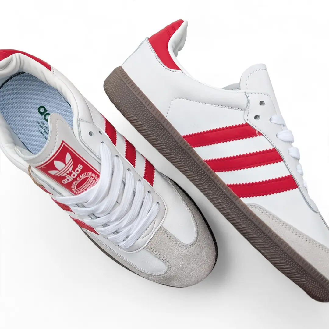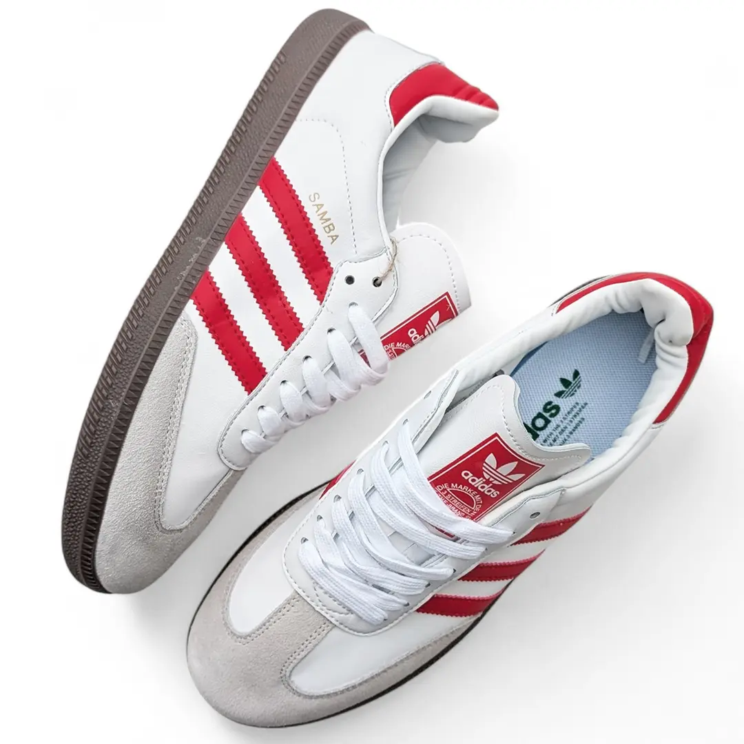 Кросівки Adidas Samba (white & red) – це поєднання культового вуличного стилю та перевіреної десятиліттями конструкції. Модель одразу впізнається завдяки контрастному бело-червоному колірному рішенню, яке виглядає свіжо як у міських образах, так і в повсякденному спортивному луці.