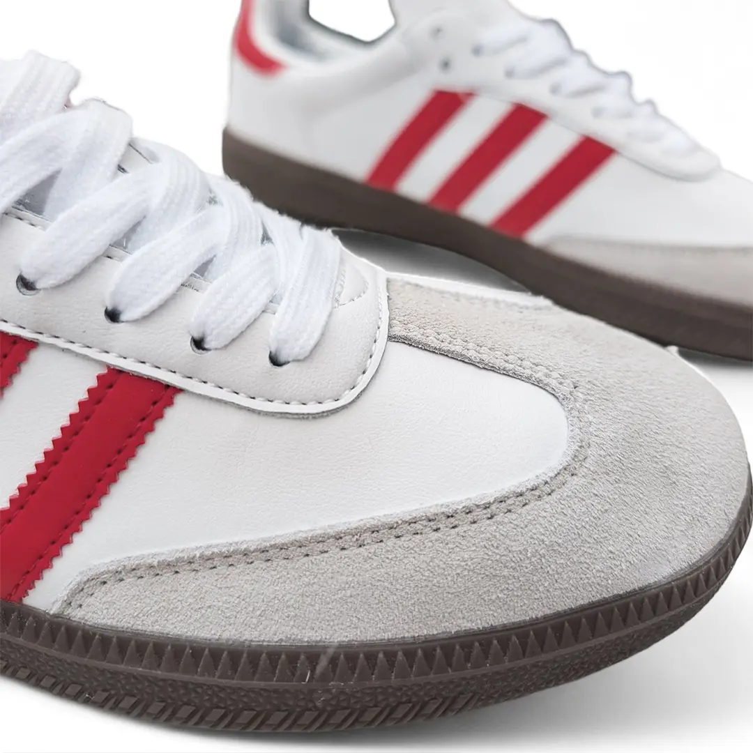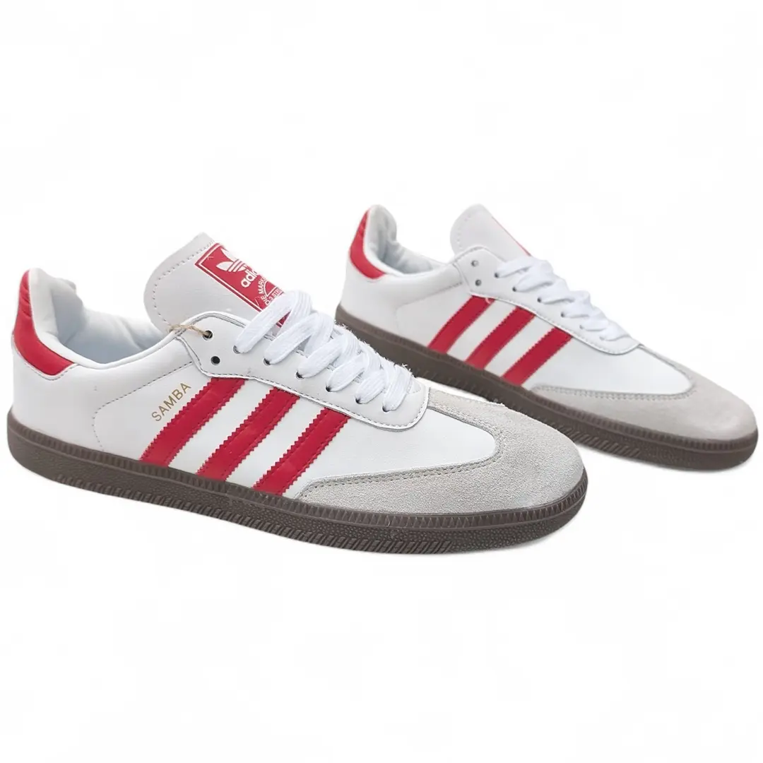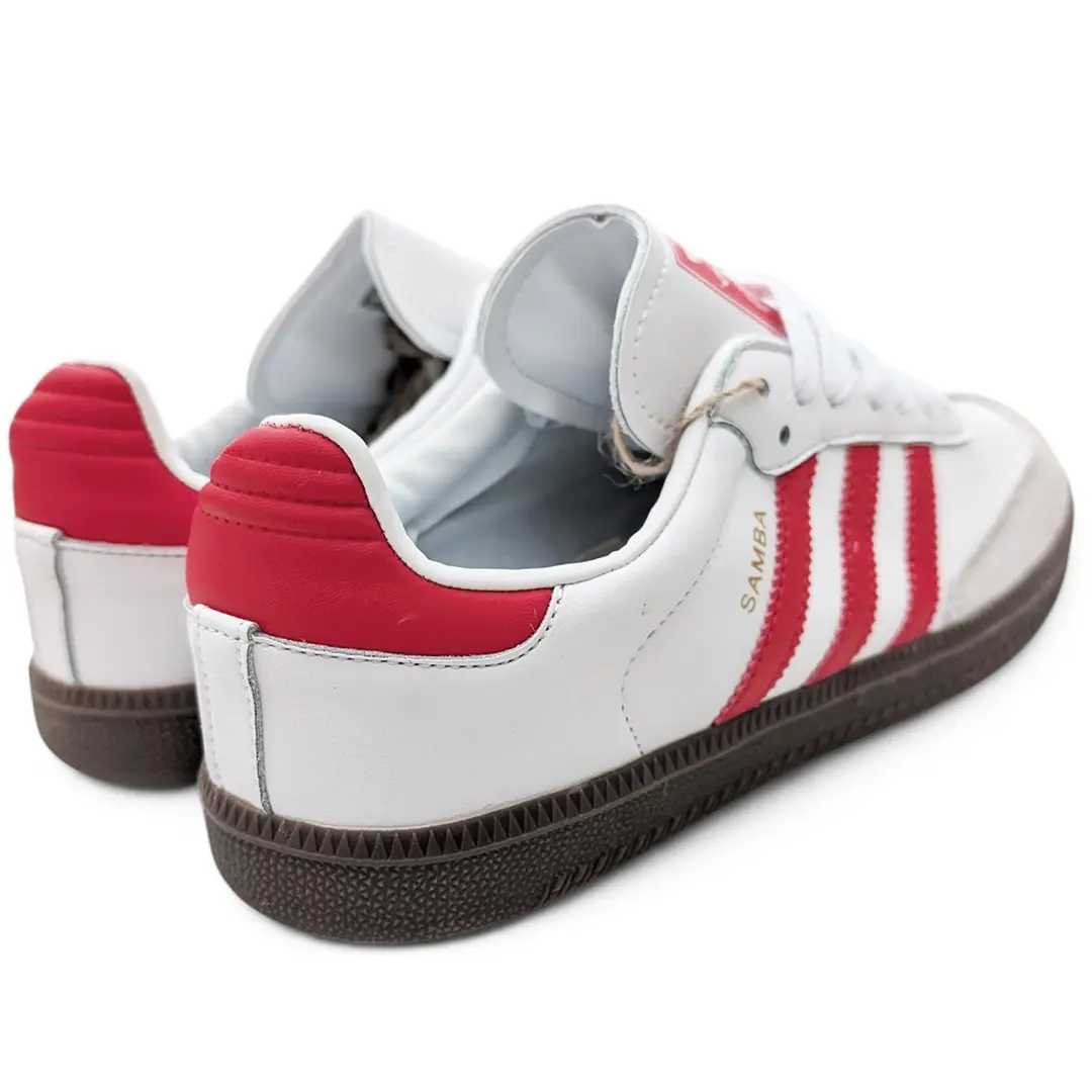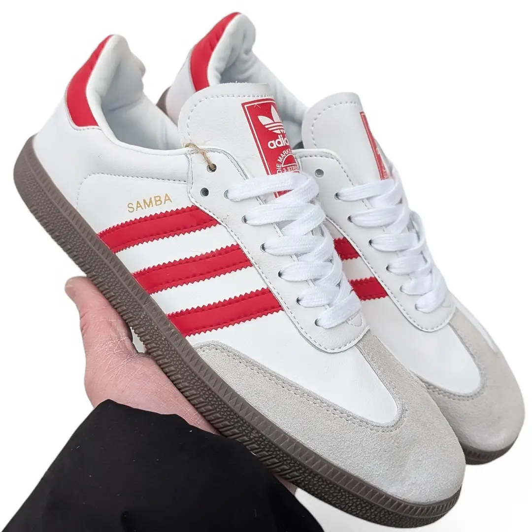 Кросівки Adidas Samba (white & red) – це поєднання культового вуличного стилю та перевіреної десятиліттями конструкції. Модель одразу впізнається завдяки контрастному бело-червоному колірному рішенню, яке виглядає свіжо як у міських образах, так і в повсякденному спортивному луці.