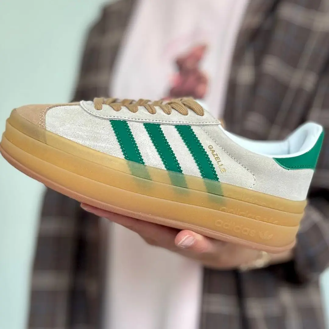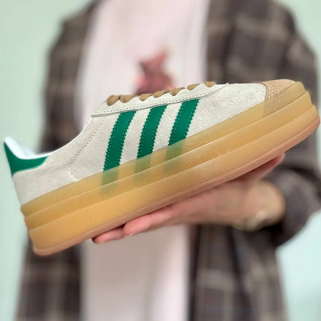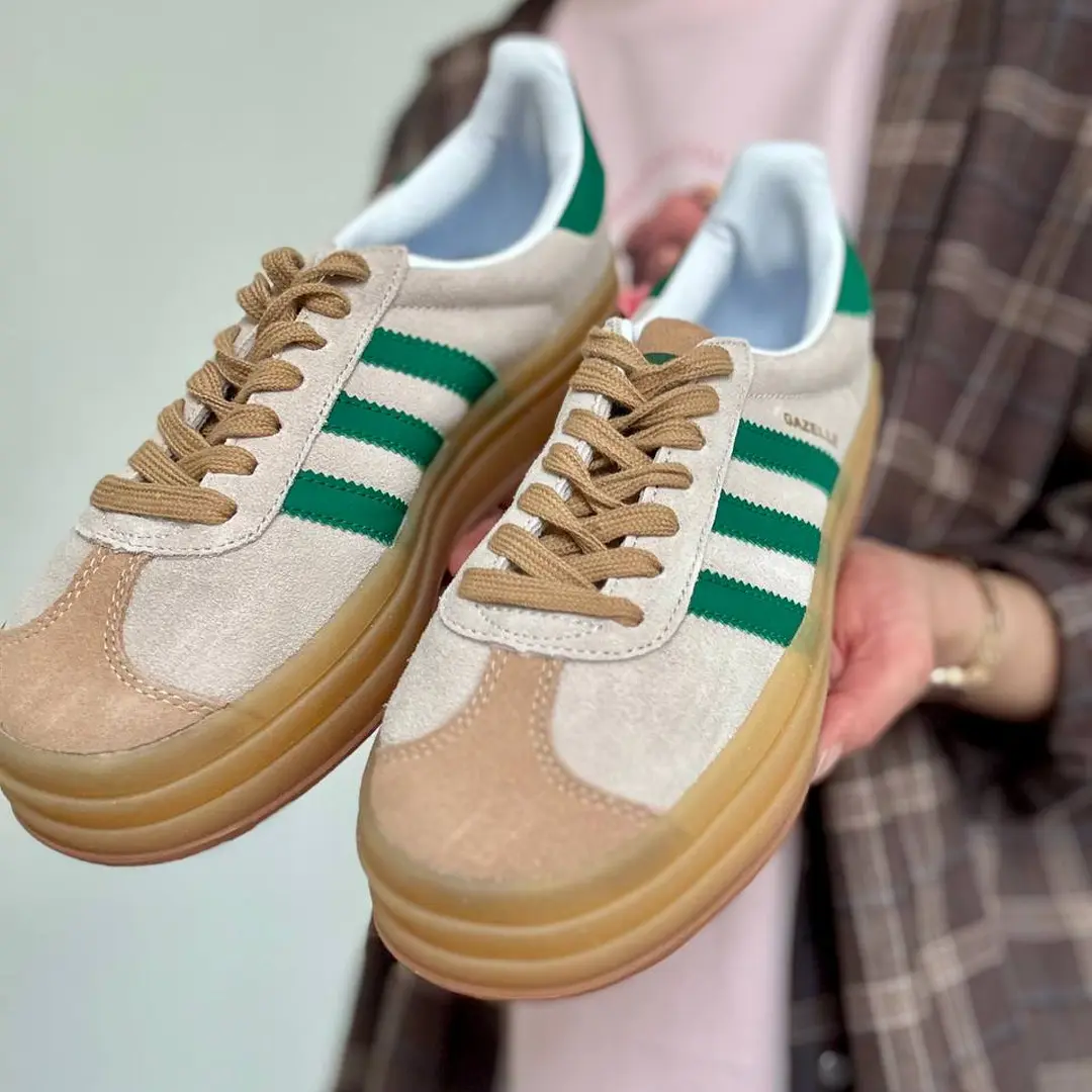 Кросівки жіночі Adidas Gazelle Bold Platform (зелені смужки) чудово поєднуються з джинсами різних фасонів – від класичних прямих до модних широких. Спробуйте носити їх зі спортивними штанами або леггінсами для створення athleisure-образу. Ці кросівки відмінно виглядають з міні-спідницями та сукнями у спортивному стилі. Для завершеності образу додайте рюкзак або сумку-crossbody, бейсболку або панаму.
