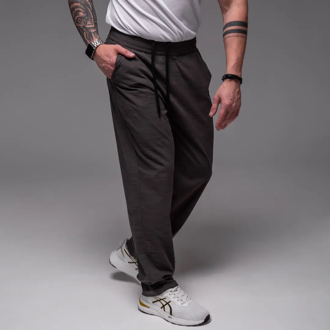 Чоловічі льняні штани великих розмірів темно-сірого кольору легко поєднуються з різним одягом. До них підійде проста однотонна футболка або сорочка з коротким рукавом. Взуттям можуть бути легкі мокасини, сандалі або кросівки. З аксесуарів достатньо простого ремінця або легкої кепки – образ готовий.