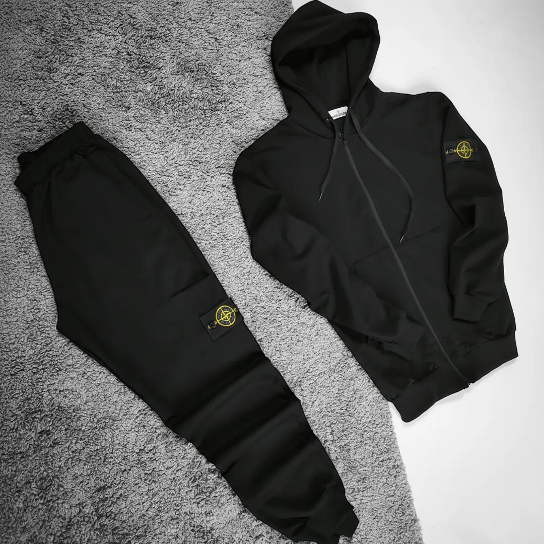 Спортивний костюм Stone Island (чорний) чудово поєднується з білими кросівками, що створює контрастний та стильний образ. Доповніть комплект кепкою або рюкзаком у нейтральних тонах для завершеного вигляду. Під кофту можна одягнути базову футболку або лонгслів, щоб адаптувати костюм до різних погодних умов.