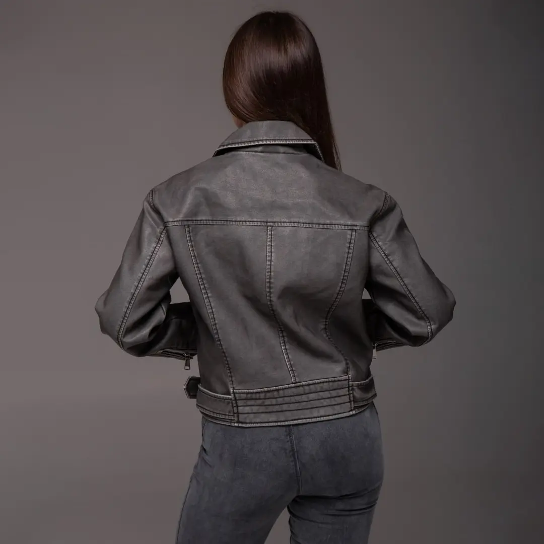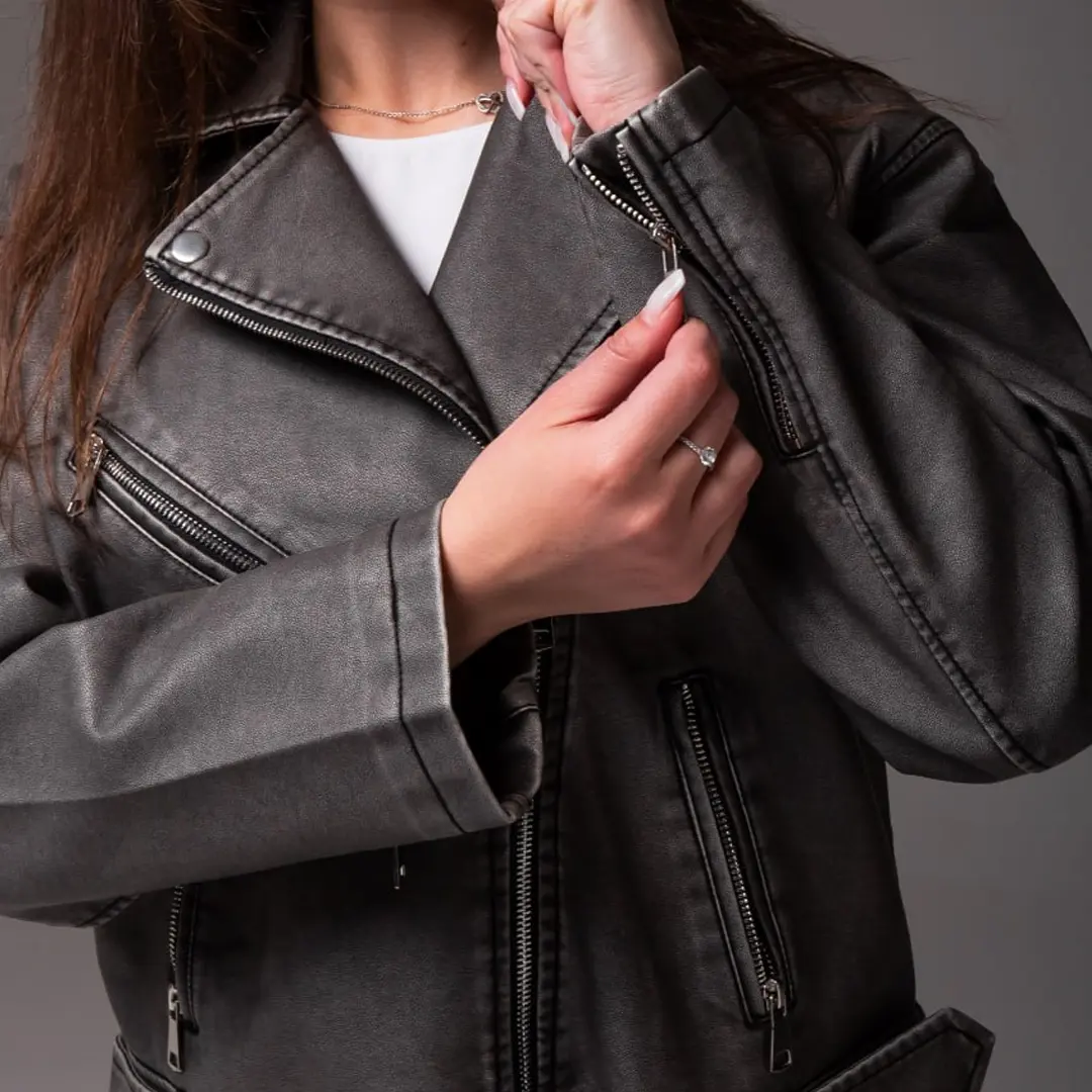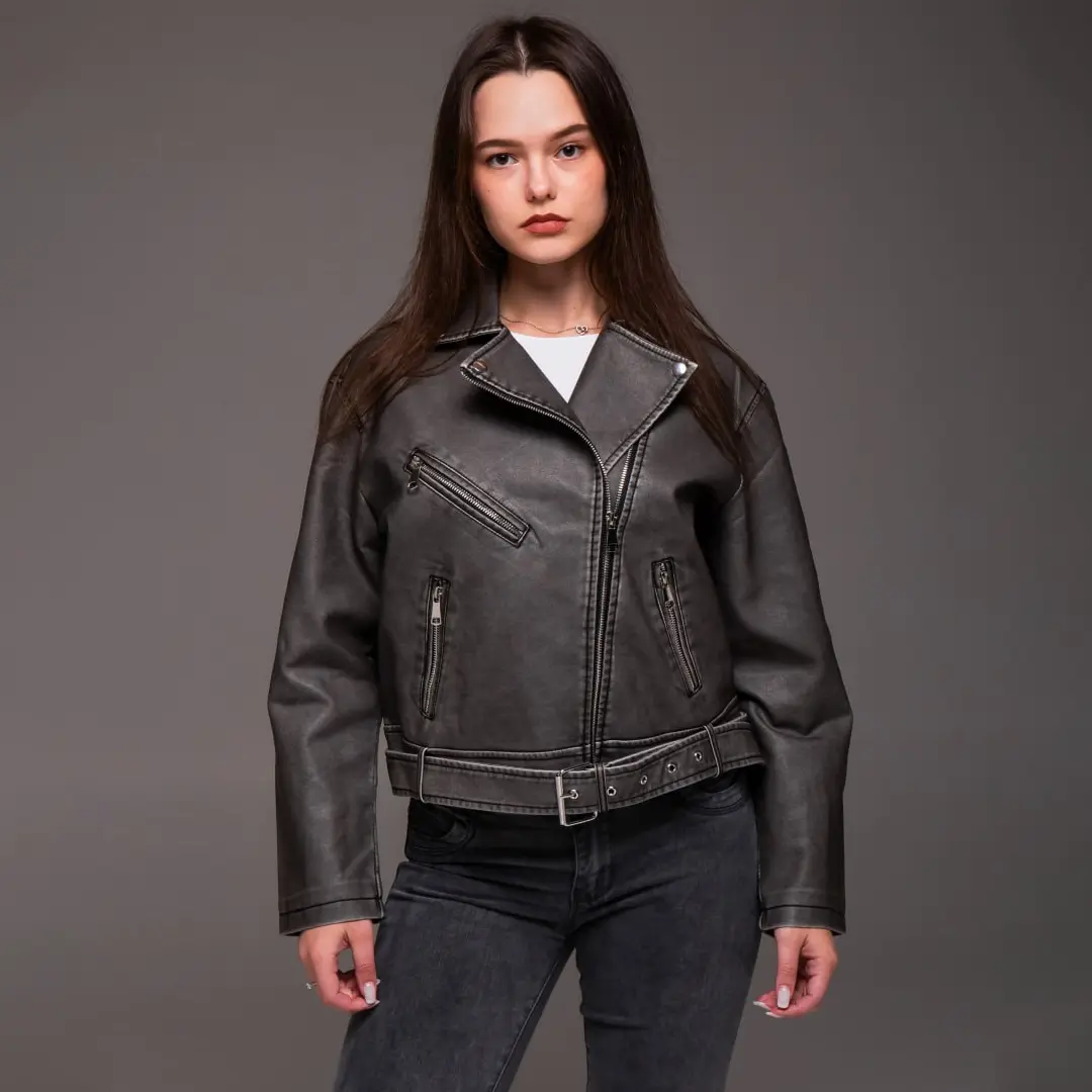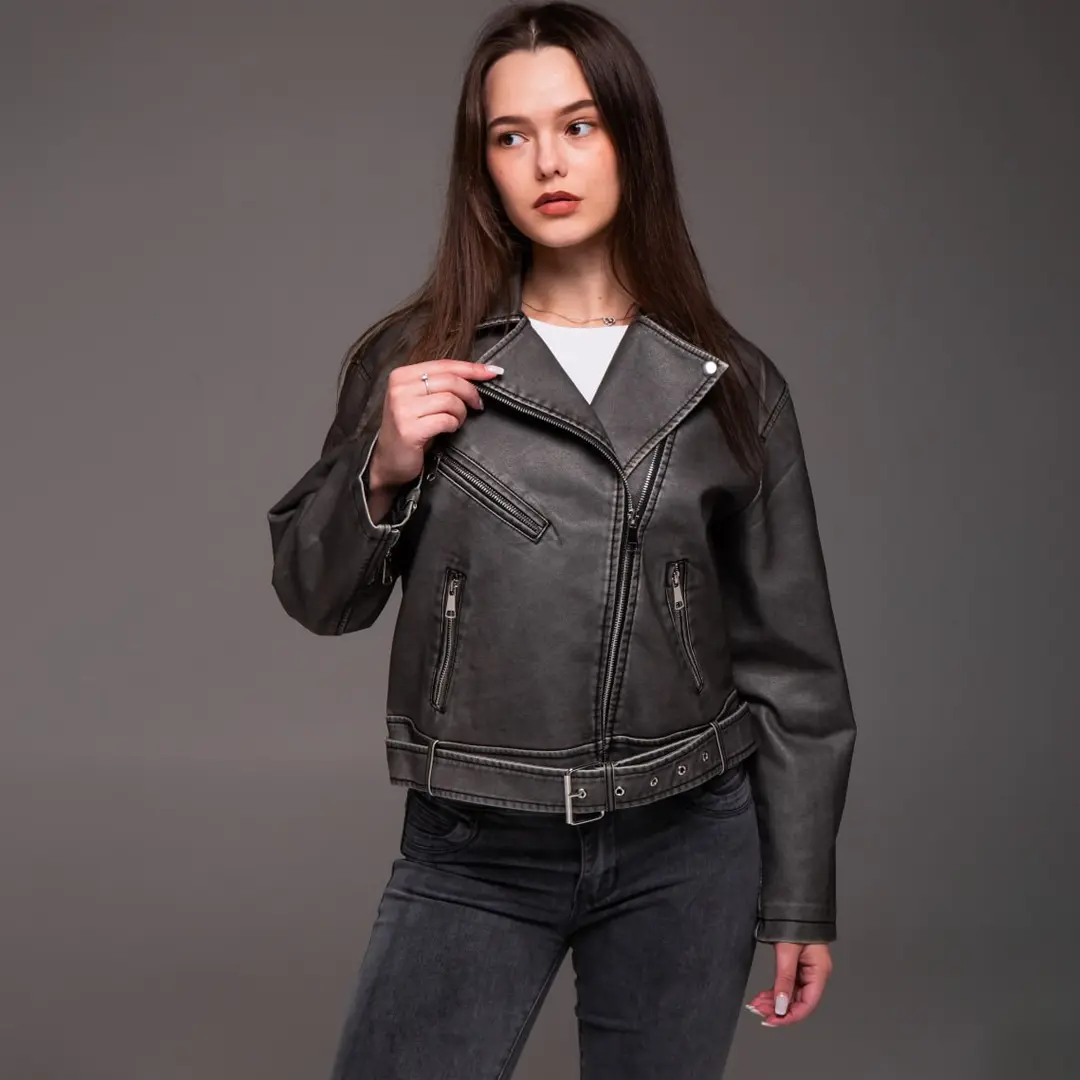 Шкіряна куртка в стилі косухи завжди залишається актуальною. Графітовий відтінок робить її універсальною для різних випадків. Доповніть свій гардероб цією стильною моделлю і створюйте трендові образи щодня.