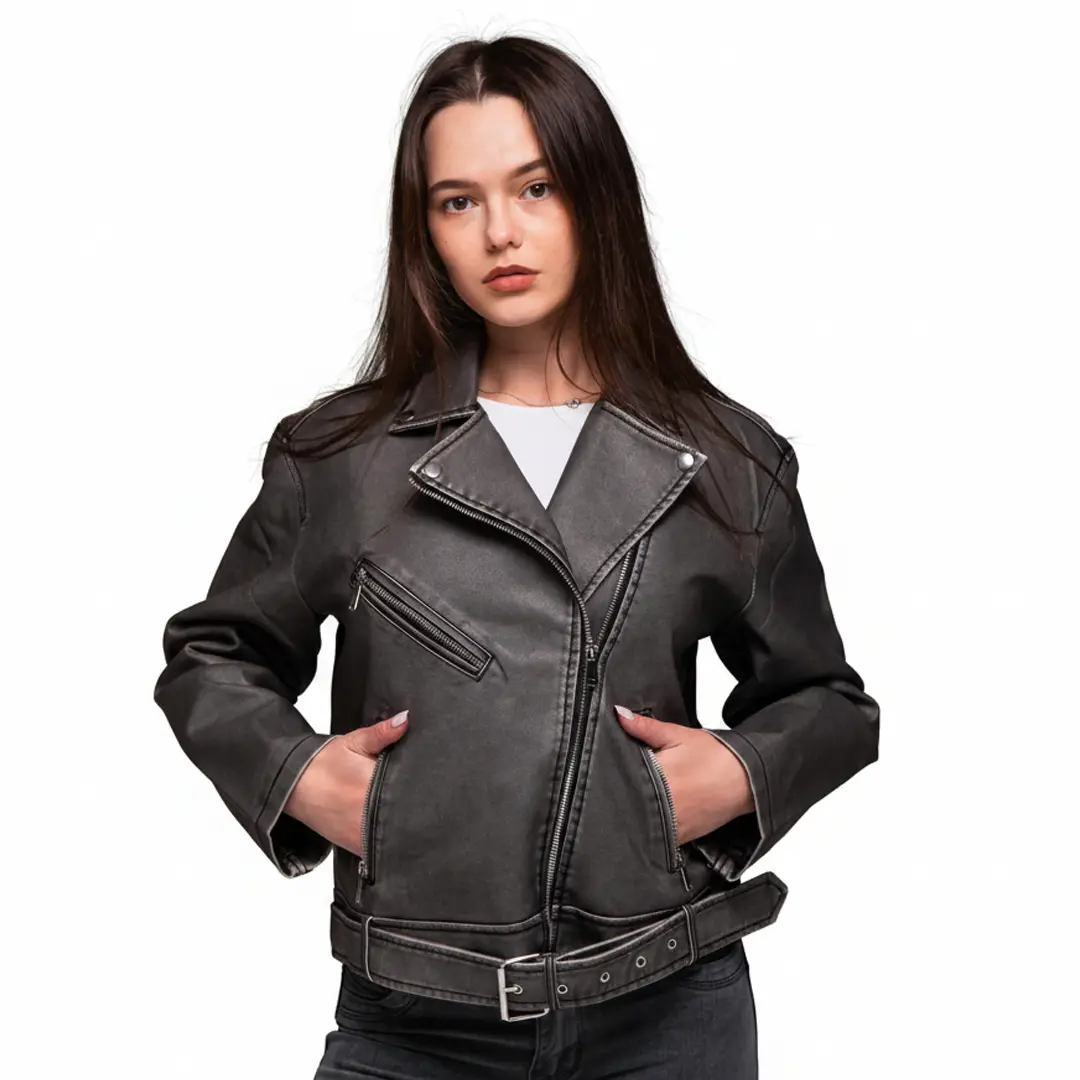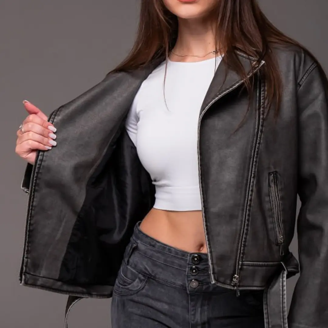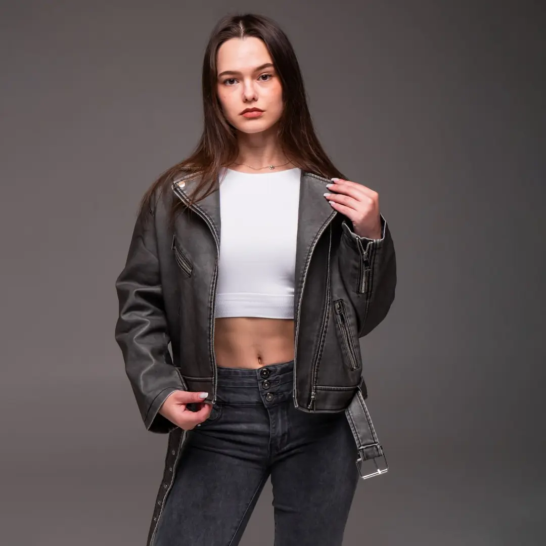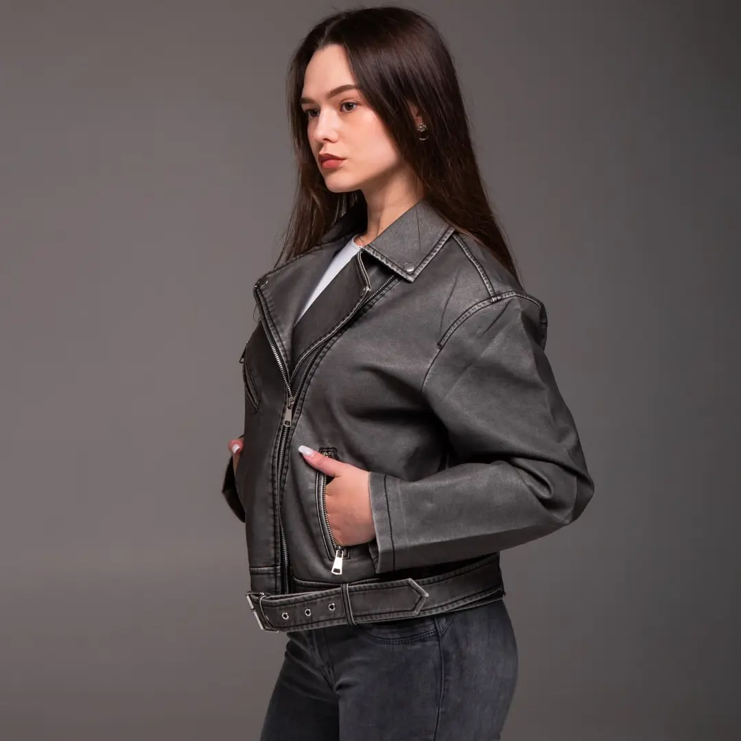 Шкіряна куртка в стилі косухи завжди залишається актуальною. Графітовий відтінок робить її універсальною для різних випадків. Доповніть свій гардероб цією стильною моделлю і створюйте трендові образи щодня.