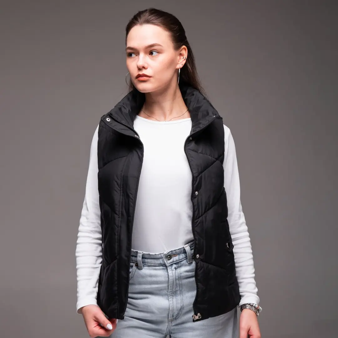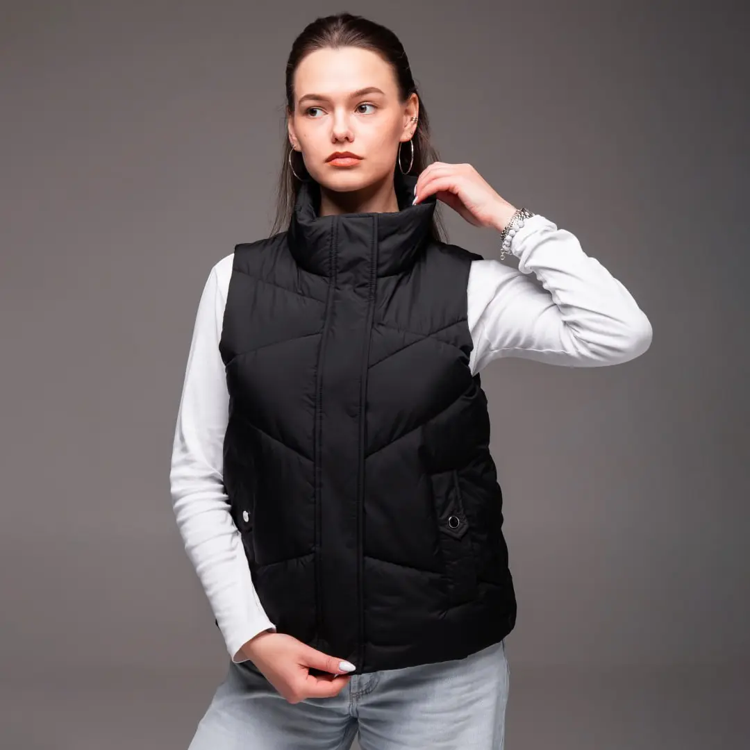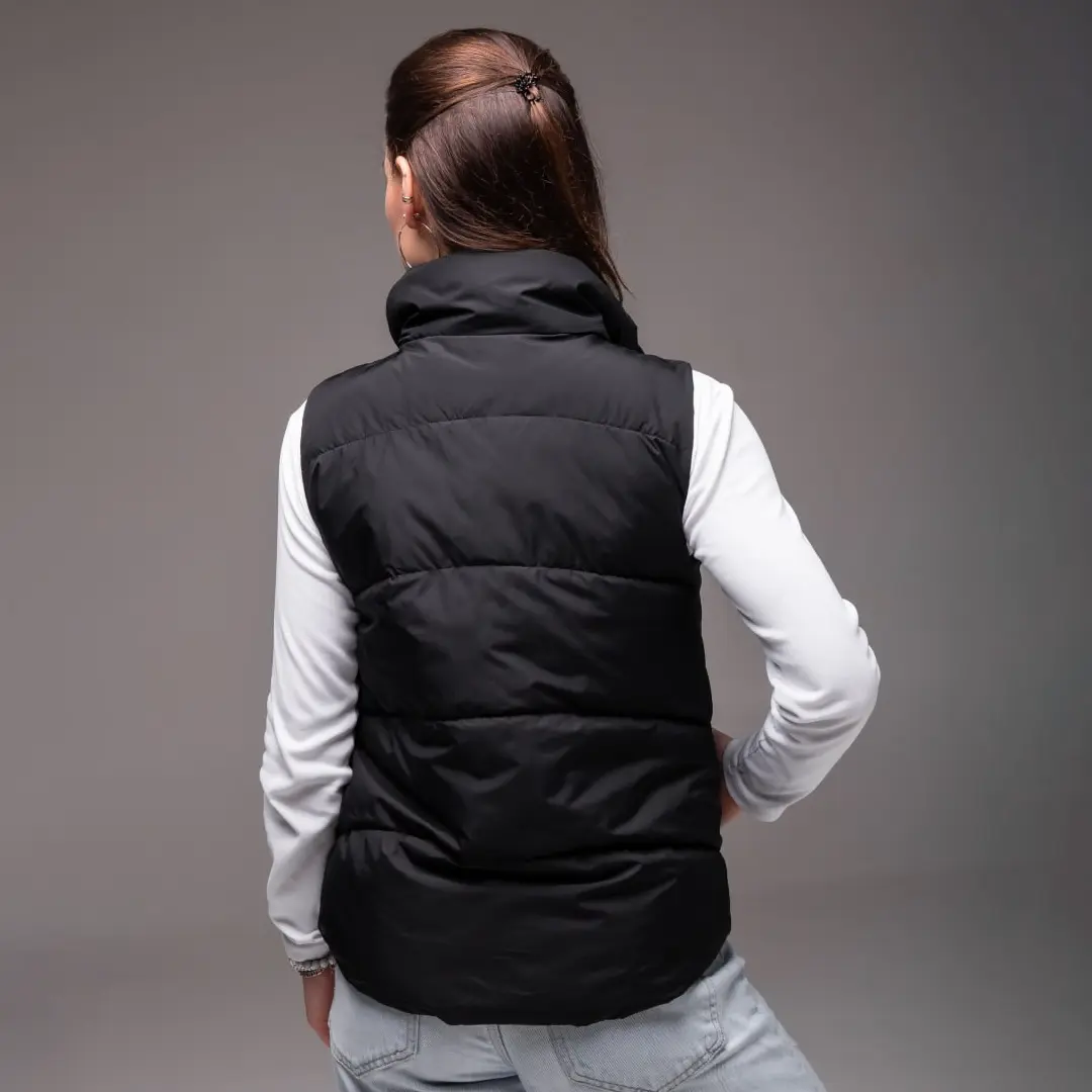 Жіноча утеплена жилетка без капюшона (чорна) – це практичний і стильний вибір для прохолодної погоди. Вона чудово тримає тепло, не обмежуючи рухів, і органічно вписується в повсякденний образ. Лаконічний чорний колір робить її універсальною річчю, яку легко поєднувати з різними образами в гардеробі.