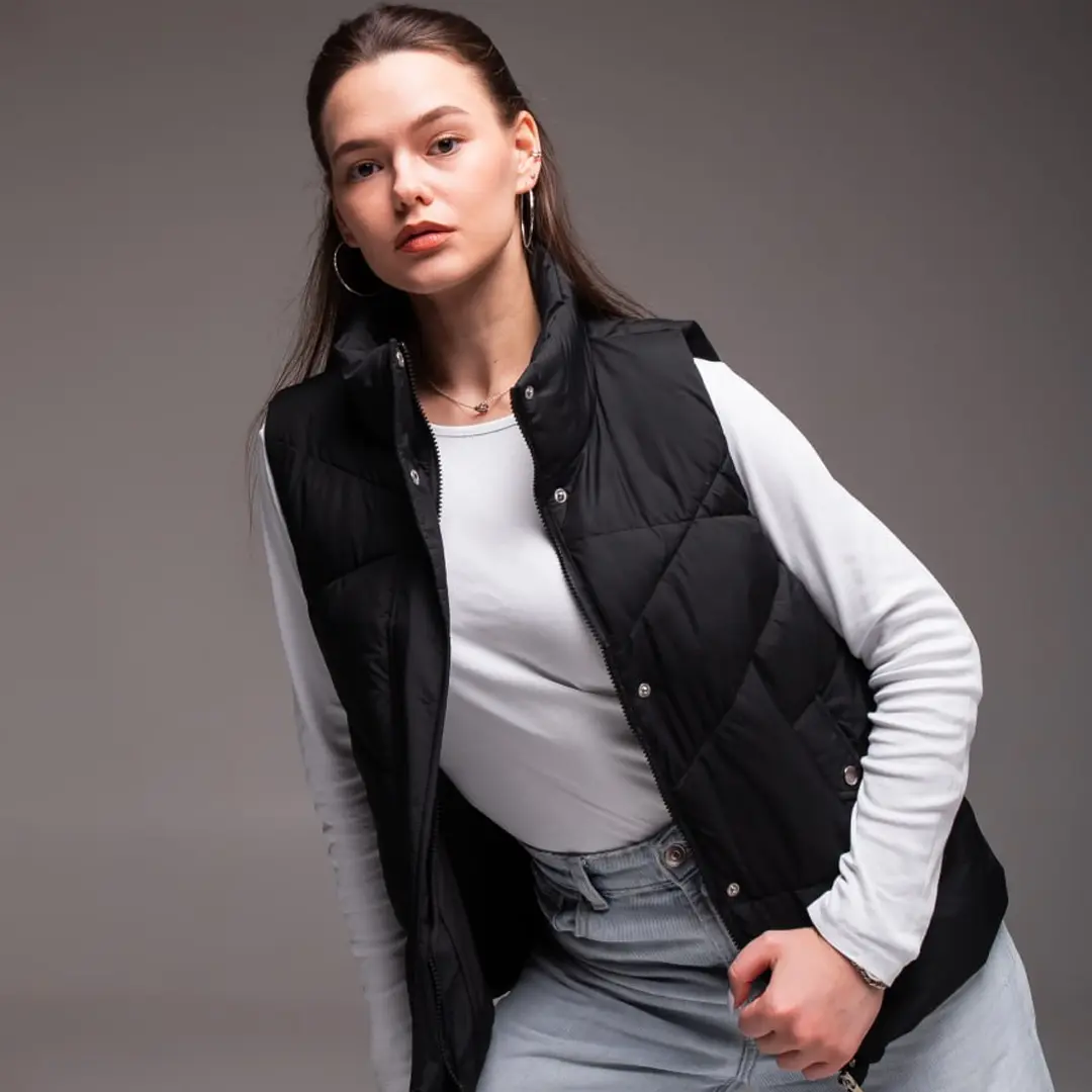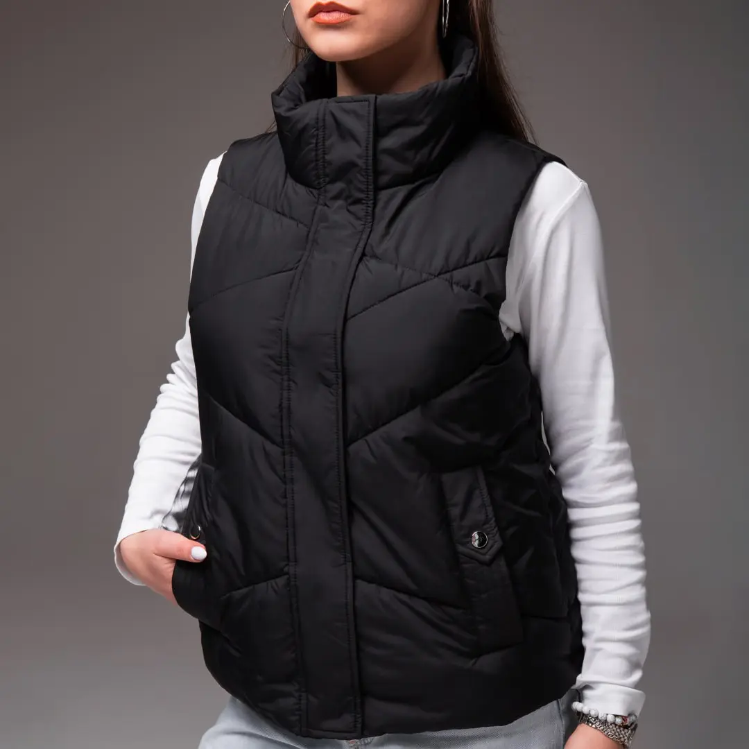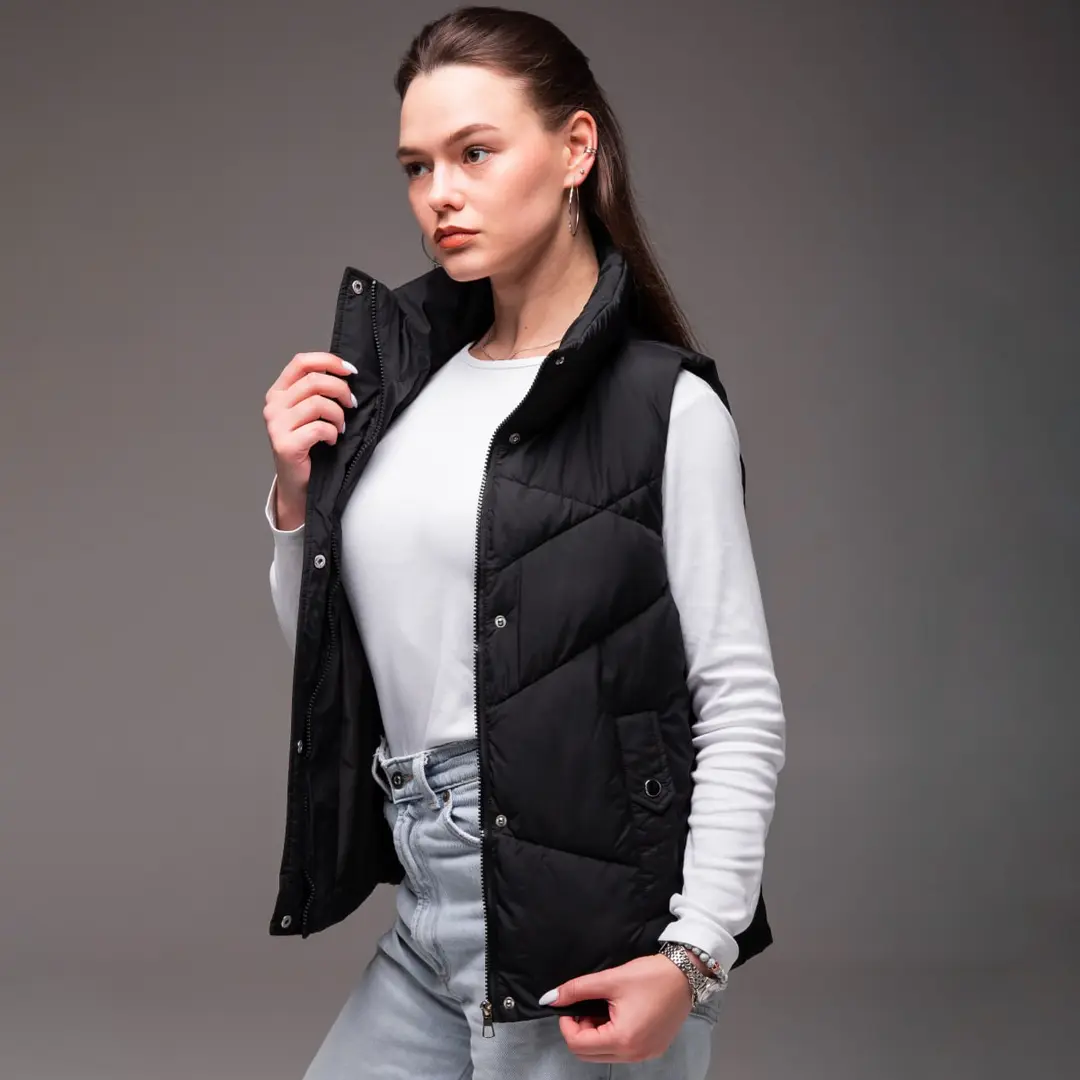 Жіноча утеплена жилетка без капюшона (чорна) – це практичний і стильний вибір для прохолодної погоди. Вона чудово тримає тепло, не обмежуючи рухів, і органічно вписується в повсякденний образ. Лаконічний чорний колір робить її універсальною річчю, яку легко поєднувати з різними образами в гардеробі.