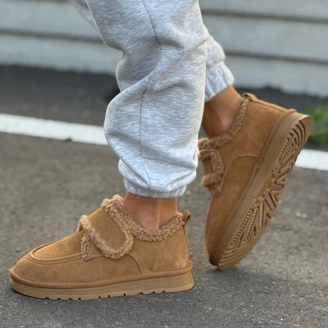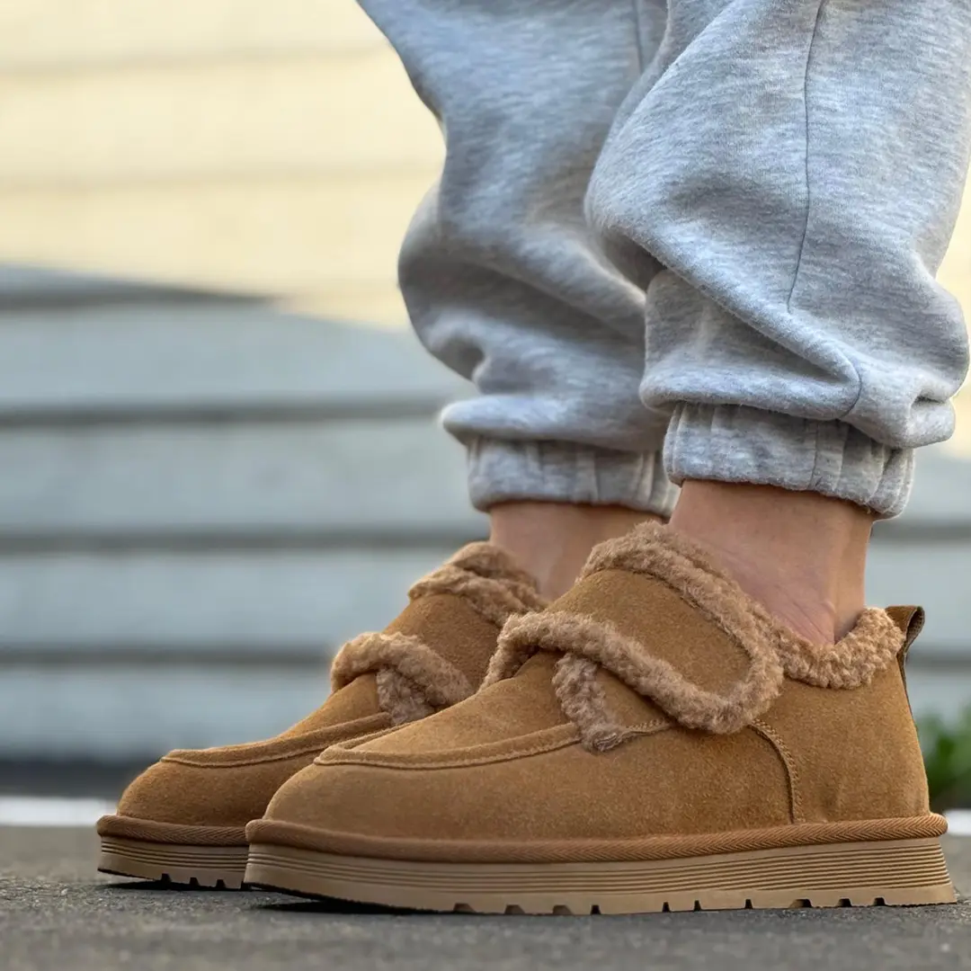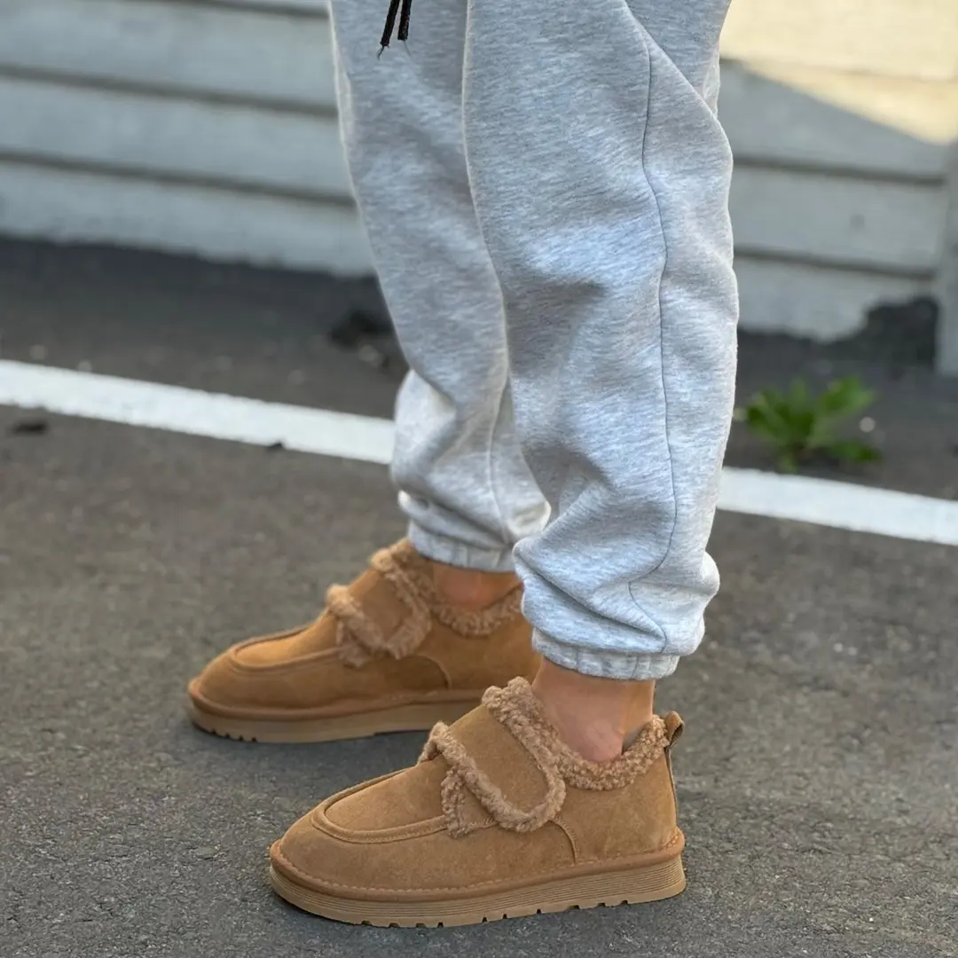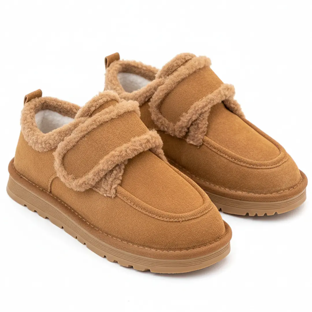 Натуральна замша у верхній частині забезпечує міцність і приємну текстуру, створюючи витончений зовнішній вигляд. Матеріал відмінно протистоїть зимовим умовам і зберігає форму навіть після тривалого носіння. Підкладка зі штучного хутра створює затишну атмосферу всередині взуття, надійно захищаючи ноги від морозу. Підошва з ТПР гарантує відмінне зчеплення з поверхнею, що особливо важливо на слизьких зимових доріжках.