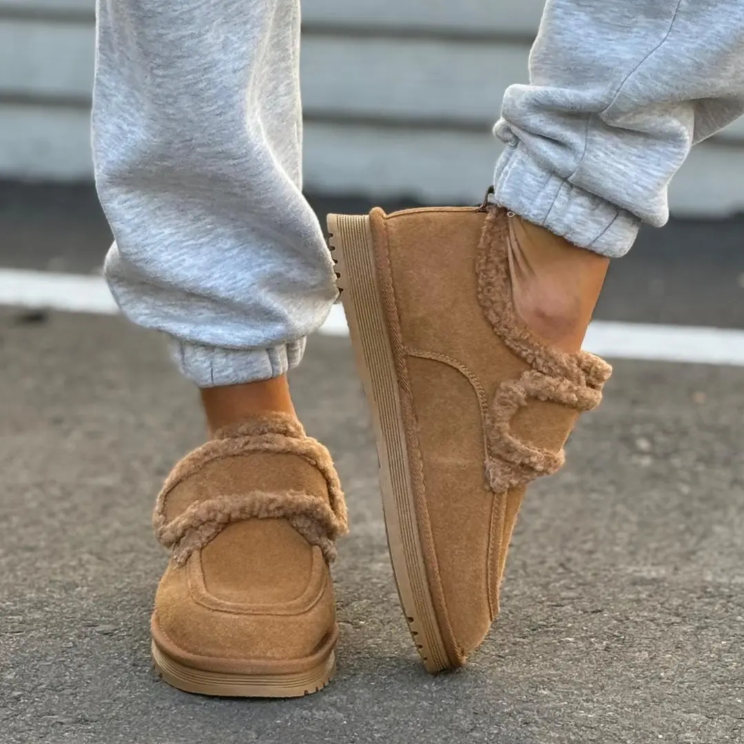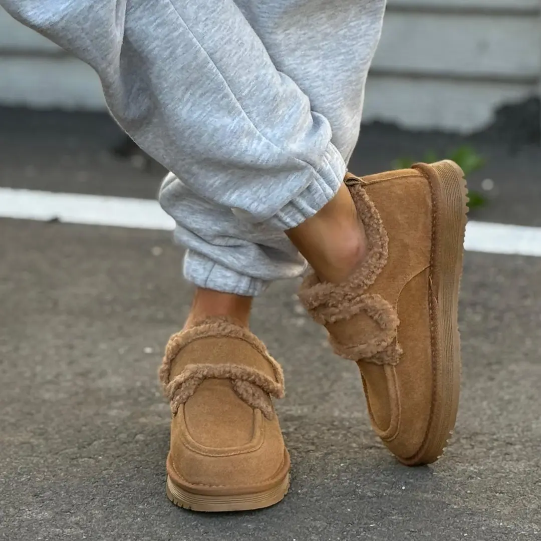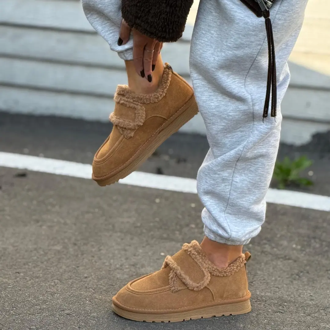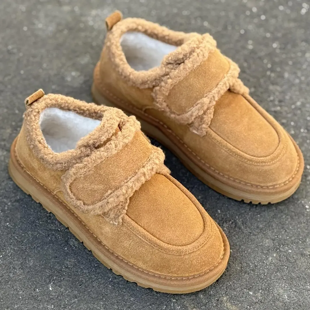 Натуральна замша у верхній частині забезпечує міцність і приємну текстуру, створюючи витончений зовнішній вигляд. Матеріал відмінно протистоїть зимовим умовам і зберігає форму навіть після тривалого носіння. Підкладка зі штучного хутра створює затишну атмосферу всередині взуття, надійно захищаючи ноги від морозу. Підошва з ТПР гарантує відмінне зчеплення з поверхнею, що особливо важливо на слизьких зимових доріжках.